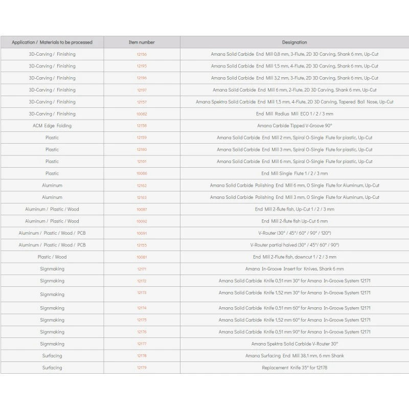 Aby uzyskać optymalny przegląd wszystkich naszych frezów palcowych i materiałów do obróbki, zapoznaj się z tabelą w galerii zdjęć.