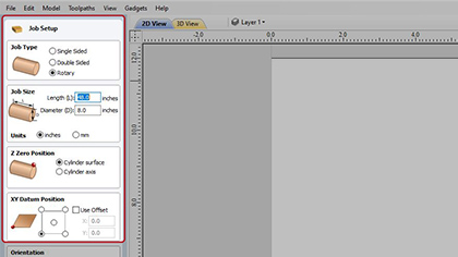 Zdefiniuj, jak chcesz obrócić materiał dla projektów dwustronnych w oknie dialogowym Job Setup (Ustawienia zadania). Wpływa to na pozycjonowanie wektorów i modeli, tak aby geometria po każdej stronie była tworzona w odpowiednich pozycjach względem strony przeciwnej.