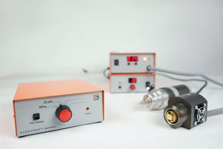 Praca z maszyną CNC staje się jeszcze bardziej efektywna przy pomocy Switch Box’a, ponieważ nie jest już wymagane czasochłonne podłączanie i rozłączanie różnych urządzeń. Poszczególne moduły elektroniki wystarczy zainstalować w rozdzielnicy, która oferuje przestrzeń do podłączenia ośmiu narzędzi. Teraz wystarczy tylko wybrać urządzenie, które chcesz używać jak np. głowica druku 3D lub wrzeciono CNC i od razu przejść do pracy.