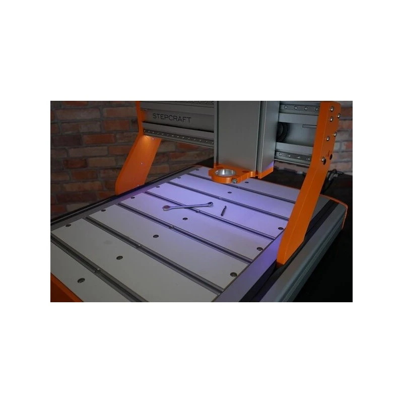 Oświetlenie maszyny jest niezbędne gdy chcesz pracować bezpiecznie i precyzyjnie. W tym celu samoprzylepna taśma LED jest przymocowana do profilu X maszyny, dzięki czemu uzyskuje się optymalne oświetlenie przestrzeni roboczej. Dołączone kable są poprowadzone przez istniejące kanały kablowe maszyny.