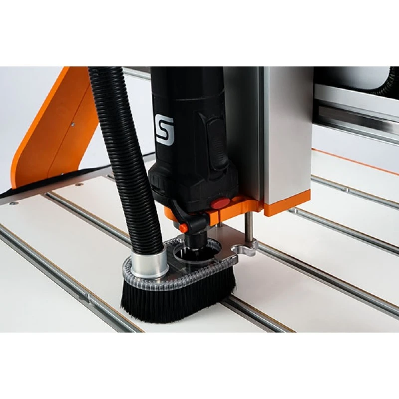 Dzięki automatycznej kompensacji wysokości 49 mm (kierunek Z) adapter odsysania dopasowuje się optymalnie do materiału obrabianego przedmiotu, a solidne szczotki dwurzędowe zapewniają bardzo dobre uszczelnienie. Prowadnica z łożyskami ślizgowymi igus® jest zintegrowana z osią Z. Dodatkowo adapter można zamocować w górnym położeniu za pomocą zamka magnetycznego podczas prac konserwacyjnych.