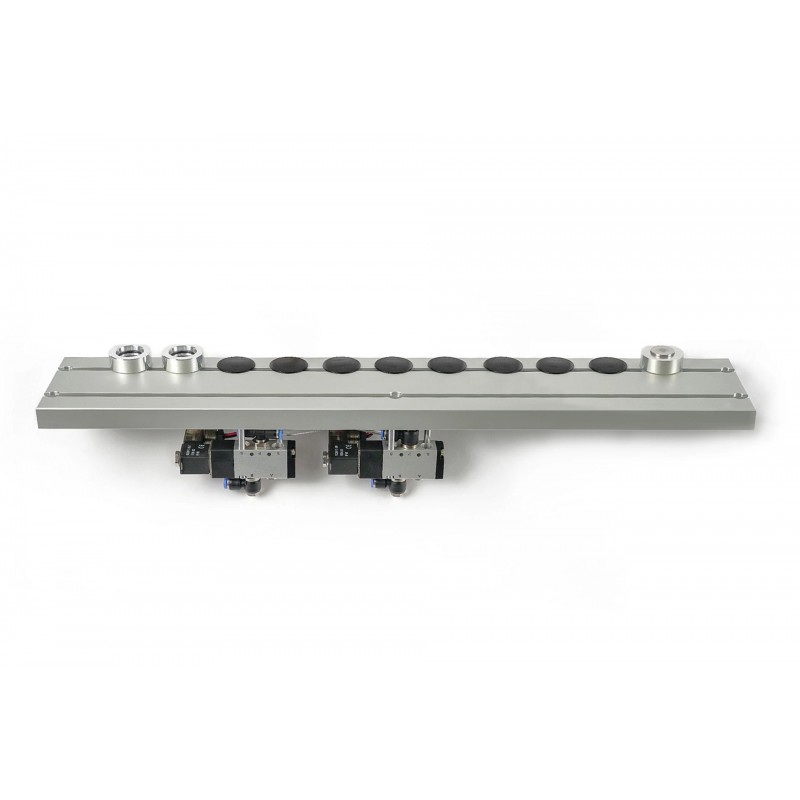 Magazyn narzędzi jest dostarczany jako częściowo zmontowany moduł i po prostu włożony w miejsce ostatniego panelu stołu (MDF lub aluminium). Za pomocą zamkniętych wtyczek nieużywane gniazda narzędziowe można łatwo zamknąć, a tym samym chronić przed kurzem. Magazyn narzędzi jest podłączony do płyty głównej serii M STEPCRAFT i sprężonego powietrza. W tym celu wymagana jest sprężarka z co najmniej 9-10 barem, który nie jest włączony do zakresu dostawy.