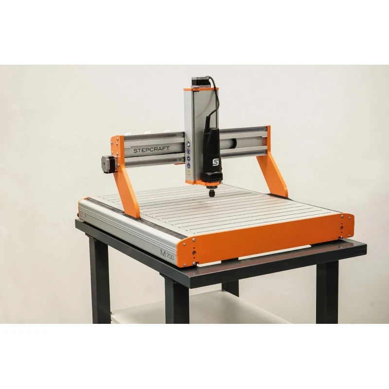 Stojak maszynowy z regulacją wysokości dla serii M składa się ze spawanej stalowej ramy i zapewnia solidną podstawę dla STEPCRAFT M.700. System CNC jest przymocowany śrubami do podstawy maszyny za pomocą gumowych nóżek w celu tłumienia drgań. Otwarta rama maszyny umożliwia boczną obróbkę większych elementów.