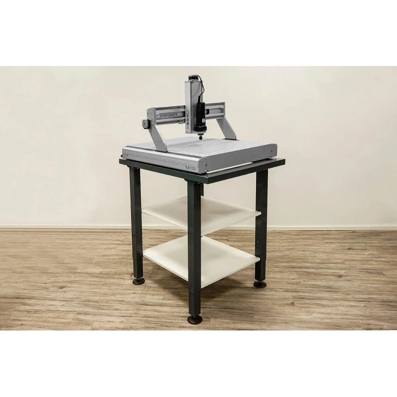 Stojak maszynowy z regulacją wysokości dla serii M składa się ze spawanej stalowej ramy i zapewnia solidną podstawę dla STEPCRAFT M.1000. System CNC jest przymocowany śrubami do podstawy maszyny za pomocą gumowych nóżek w celu tłumienia drgań. Otwarta rama maszyny umożliwia boczną obróbkę większych elementów.