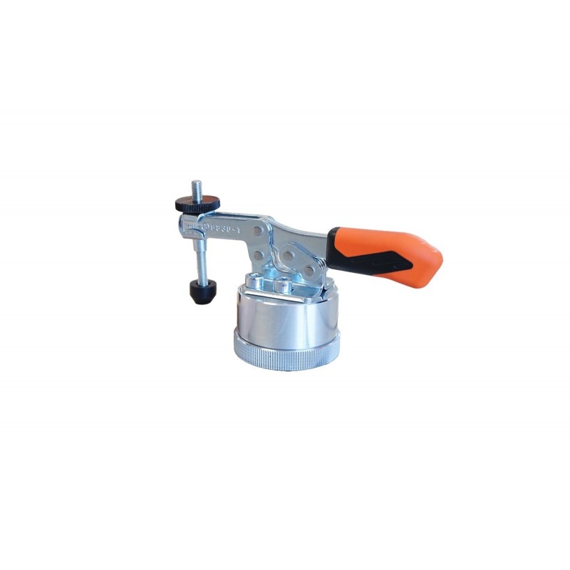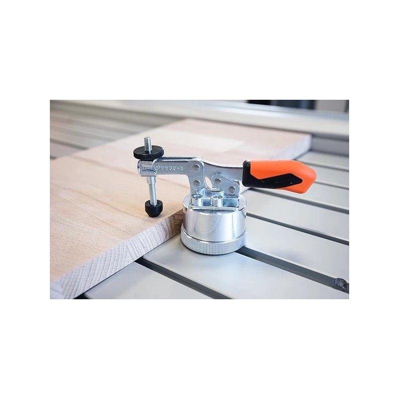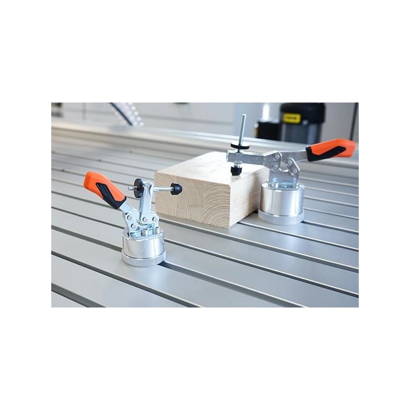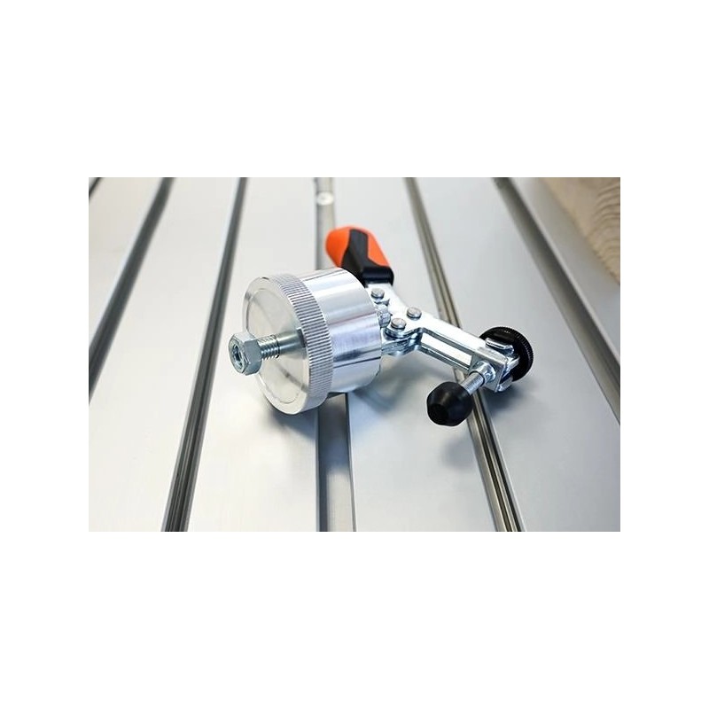 Docisk poziomy umożliwia zmienne i beznarzędziowe mocowanie różnych detali. W tym celu mocuje się go do stołu z rowkiem T serii STEPCRAFT Q za pomocą gwintu M8. Dzięki ergonomicznej, olejoodpornej rękojeści, dużej powierzchni chwytnej i blokowanej nakrętce radełkowanej śruby dociskowej na końcu ramienia dociskowego, docisk poziomy jest łatwy i wygodny w użyciu.